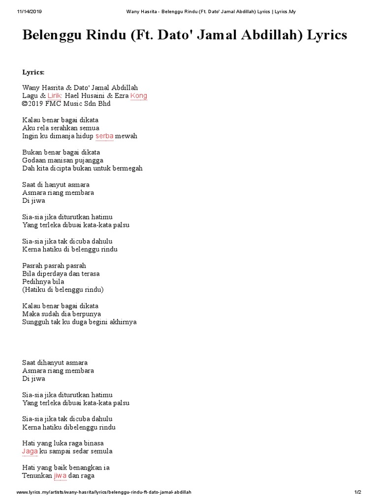 Wany Hasrita Belenggu Rindu Ft Dato Jamal Abdillah Lyrics Lyrics My Pdf